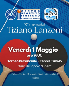 VENERDI 1 MAGGIO 2026 – 10° Memorial Tiziano Lanzoni – Torneo di Doppio Tennistavolo Venerdì 1 Maggio 2026, ore 9:00 presso il Palazzetto San Domenico Savio, via Cardan 12, Padova Torna…