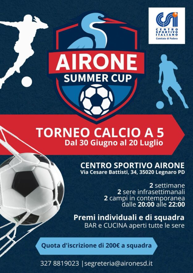 Dal 30 GIUGNO al 2 LUGLIO Centro Sportivo Airone, Via Cesare Battisti 34, Legnaro, Padova Per informazioni: 3278819023 | segreteria@aironesd.it ISCRIVI LA TUA SQUADRA