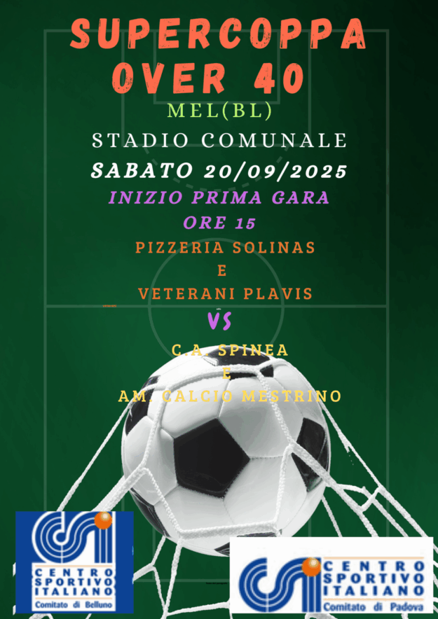Sabato 20 Settembre presso lo Stadio Comunale di Mel (BL) con inizio alle 16.00 ci sarà la Supercoppa CSI 2025 Ober 40. Locandina