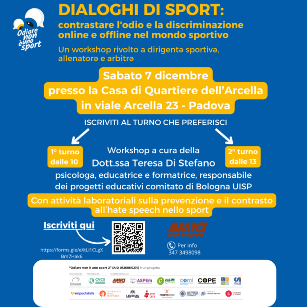 SABATO 7 DICEMBRE 2024 – Contrastare l’odio e la discriminazione on line e offline nel mondo sportivo. Workshop rivolto a dirigenti sportivi, allenatori e arbitri.